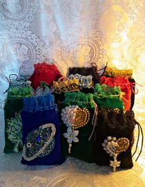 Bu go‘zal estalik qopchalar atlas matodan tikilgan, zich va sifatli bo‘lib, uzunligi 24 sm, eni 16 sm.