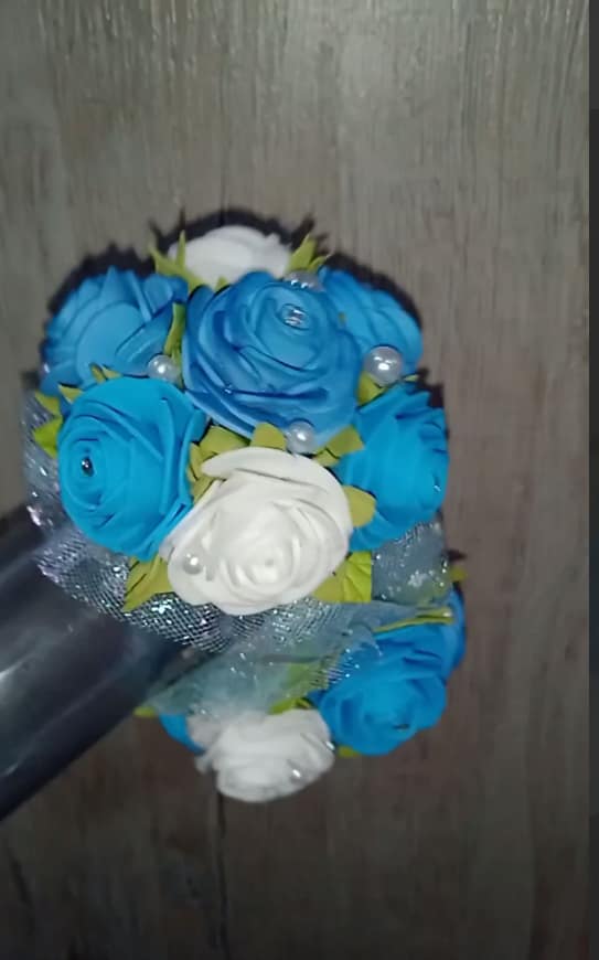 Buketchada ko‘k va oq atirgullar, mayin yashil bargchalar va marvarid boncuklar ishlatilgan. Yengil fatin unga hajm va bayramona kayfiyat beradi.
