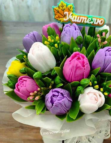 “Sizniki — sizga xos” tamoyili bilan tayyorlanadigan bu kompozitsiya ism, laqab yoki harflar ko‘rinishida joylashtirilgan qizil sovun atirgullardan iborat. Suratdagi namunada “Jannatim” g‘oyasiga mos, yorqin va e’tiborni tortuvchi dizayn ishlangan. Har bir gul qo‘l mehnati bilan yasaladi; gulbarglarning spiral tuzilishi jonli atirgul taassurotini beradi. Yengil aroma xonaga yoqimli muhit bag‘ishlaydi, ranglar oqarmaydi, shakli uzoq muddat saqlanadi. Ishlatilgan materiallar allergiyasiz, shu sabab uy, ofis, tadbir va fotosessiyalar uchun ham xavfsiz.