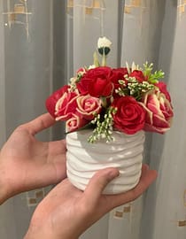 Keng pushti savatchaga joylashtirilgan ko‘p dona sovundan lola kompozitsiyasi — onajonlar, ustozlar va yaqinlar uchun katta hajmli, ko‘zni quvontiradigan nafis sovg‘a. Har bir lola qo‘l bilan ishlangan bo‘lib, gulbarglarning silliq tuzilishi haqiqiy lola ko‘rinishini beradi. Hidini yillar davomida saqlaydi, ranglari oqarmaydi, materiallari allergiyasiz. Savatcha ustiga qo‘yilgan yog‘och yozuvni siz xohlagan matnga moslaymiz: “Jannatim — onam”, “Tabriklayman”, “Sevgi” va boshqalar. Kompozitsiya uy interyerida, tantanali dasturxon chetida, lobby yoki resepsion stolida juda chiroyli aks etadi; parvarishi oddiy — vaqti-vaqti bilan changini artish kifoya. Ranglar palitrasi (turli pushti ohanglar, oq, kremsimon) va lola sonini didingizga ko‘ra belgilaymiz; qo‘shimcha ravishda kichik xo‘rozqandlar, lenta, kartochka va bejirim qo‘ng‘iz bezaklari qo‘shib beramiz. Narx buyurtma murakkabligi va lola soniga bog‘liq, o‘rtacha 100 000 so‘mdan boshlanadi. Bajarilish muddati 1–14 kun (hajm va detalga qarab). Har bir buyurtma Munira Boymuhammedova tomonidan sifat nazorati bilan tayyorlanadi. 📲 Buyurtma va maslahat: +998 99 398 26 69 (KB-Store). Rang, yozuv va o‘lchamni ayting — biz orzungizdagi savatni aynan siz uchun yasaymiz.